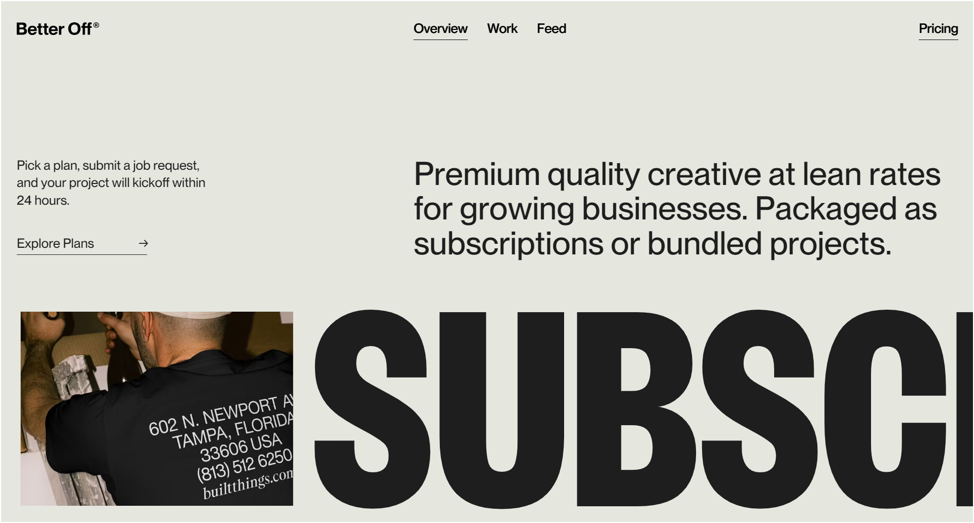DESCRIPTION|Premium quality creative at lean rates for growing businesses. Packaged as subscriptions or bundled projects. It’s brand services made easy and affordable.