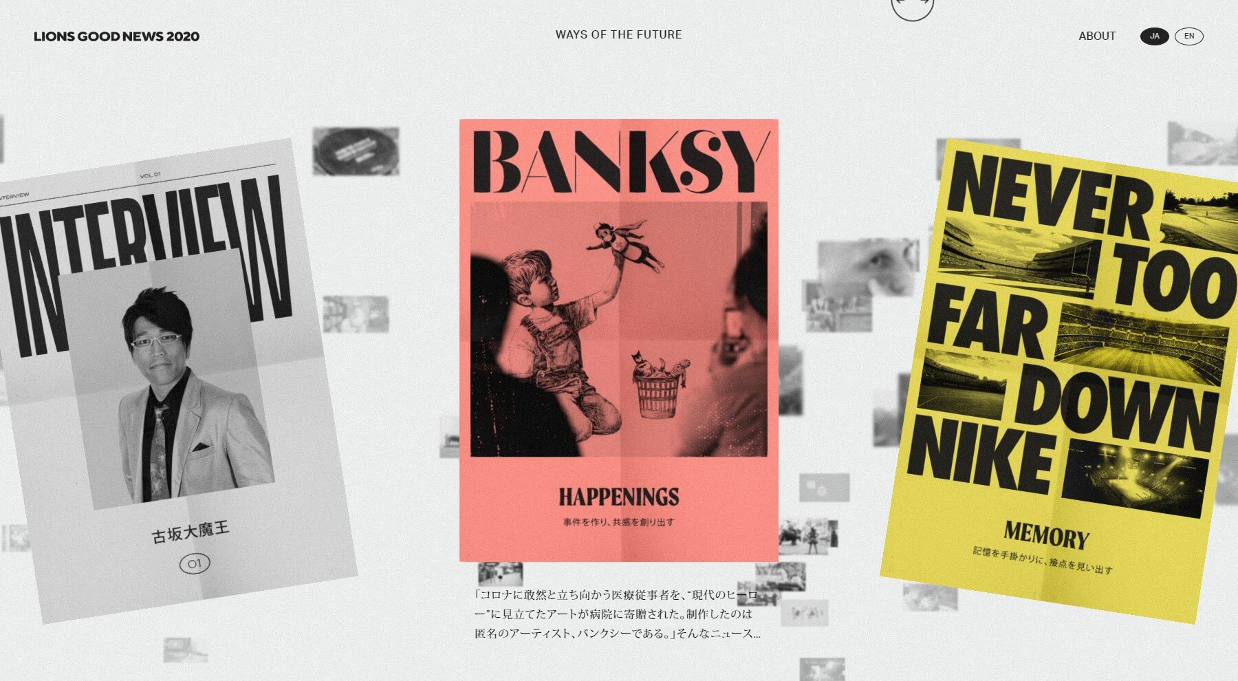 DESCRIPTION|「LIONS GOOD NEWS2020」は、PR LIONSの10年を記念して作られたコンテンツです。コロナ禍の中、世界で取り組まれたクリエイティブなグッドニュースをピックアップしています。また、それらの中に垣間見られるPRやクリエイティブのエッセンスを過去のカンヌライオンズの受賞作品と比較しながら、今後のコミュニケーション業界における10の潮流としてまとめました。