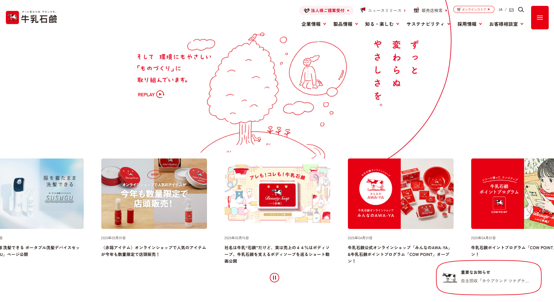 DESCRIPTION|牛乳石鹸共進社が運営するウェブサイトへようこそ。当サイトでは製品情報をはじめ、創業110余年を迎えた牛乳石鹸の歴史や石鹸に関する情報などのコンテンツをご用意しております。ぜひお立ち寄りください。