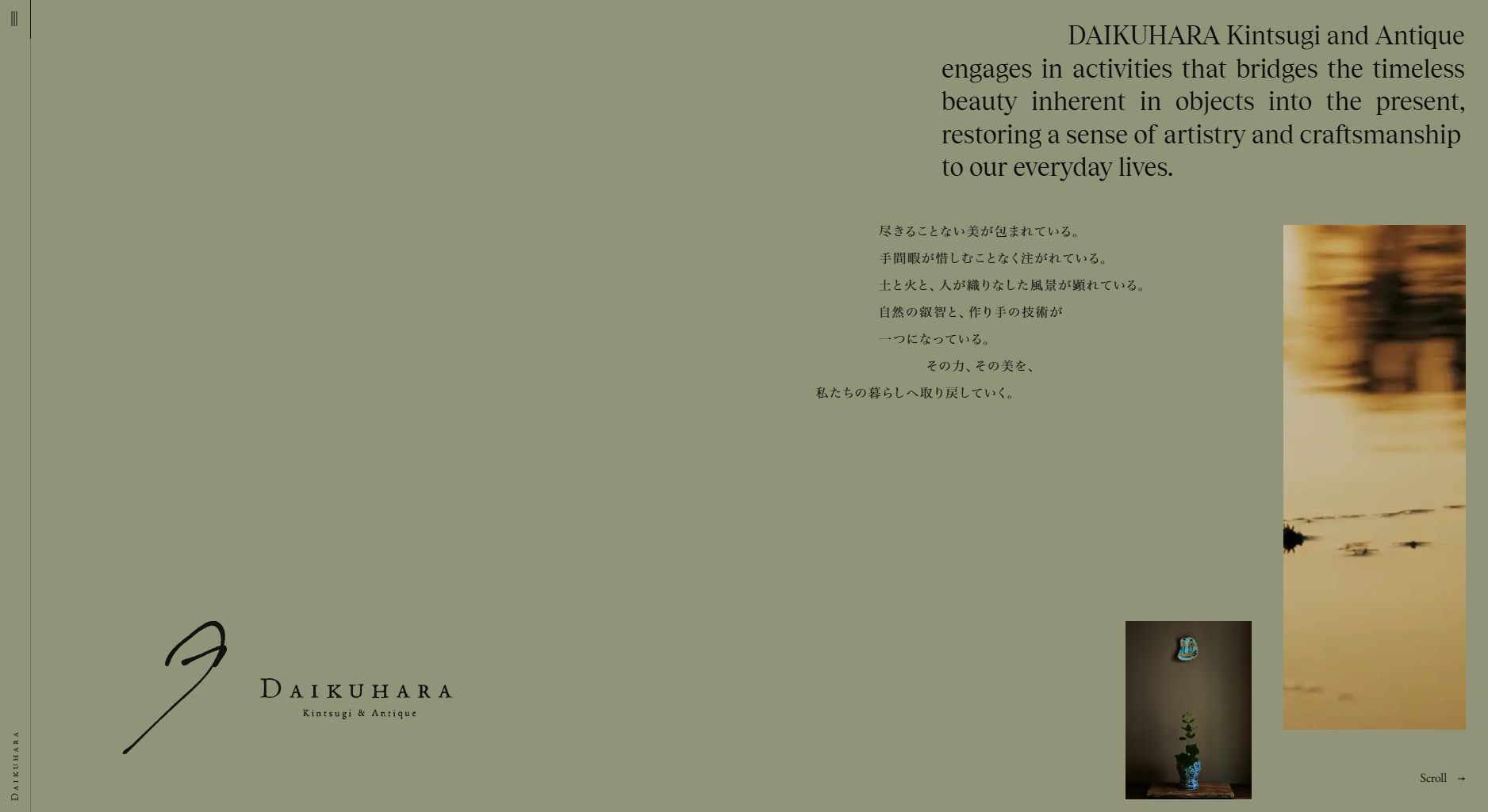 DESCRIPTION|DAIKUHARA Kintsugi and Antiqueは、時を超え、ものに宿る美を現代に繋ぎ、その美と手仕事の力を日常生活へ戻すための活動をしています。