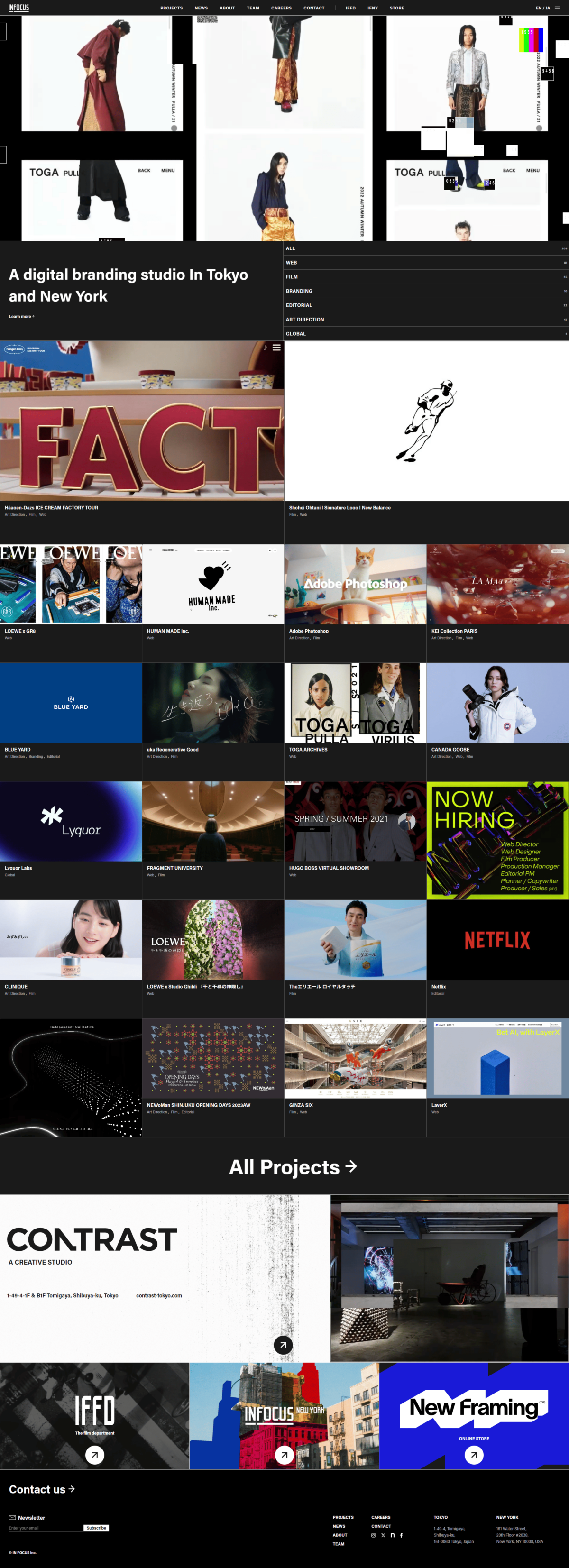 DESCRIPTION|IN FOCUSは、東京とニューヨークを拠点に活動するデジタルブランディングスタジオです。多様な専門性を持つメンバーが企業やブランドの核にあるストーリーや独自性をコンセプトに、Web、映像、グラフィック、写真といった領域を横断し、新しい視点を提案します。