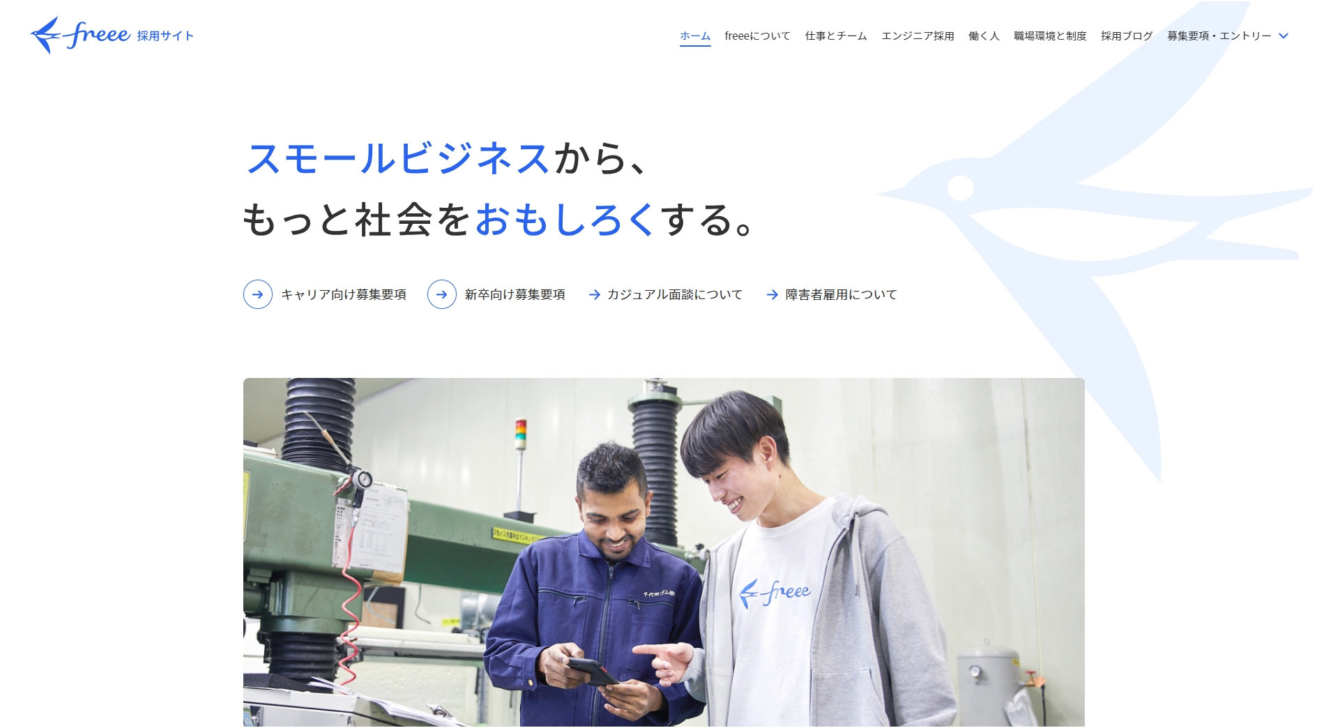 DESCRIPTION|freeeの採用サイトです。キャリア採用、新卒採用、インターンシップの情報を掲載しています。職種ごとの募集要項、ミッション・ビジョン、サービス、カルチャー、社員インタビュー、評価制度、福利厚生、成長支援、オフィス、採用ブログなどを紹介します。