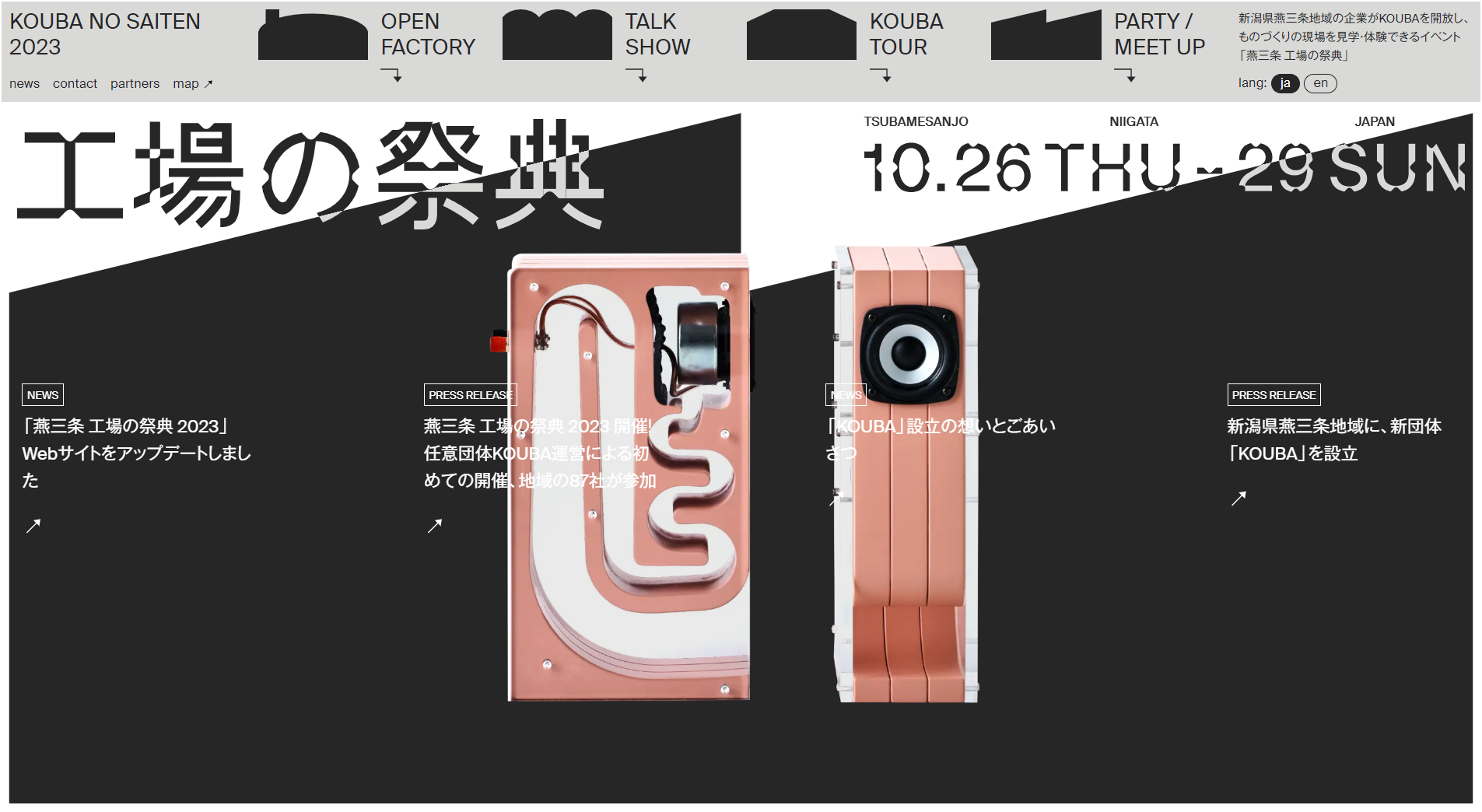 DESCRIPTION|「燕三条 工場の祭典 2023」のテーマは「WHAT IS KOUBA?」。機械加工の“工場“だけでも、手仕事の“工房“だけでもない、多様なものづくりが重なり合う「KOUBA」の本質を探求し、その魅力を発信します。これまでの工場見学だけでなく、祭典初のトークショーでは特別ゲストを招待。さらに、コンセプトツアーや新デザインの展示など、多様な視点で地域のものづくりや職人の活動を紹介します。