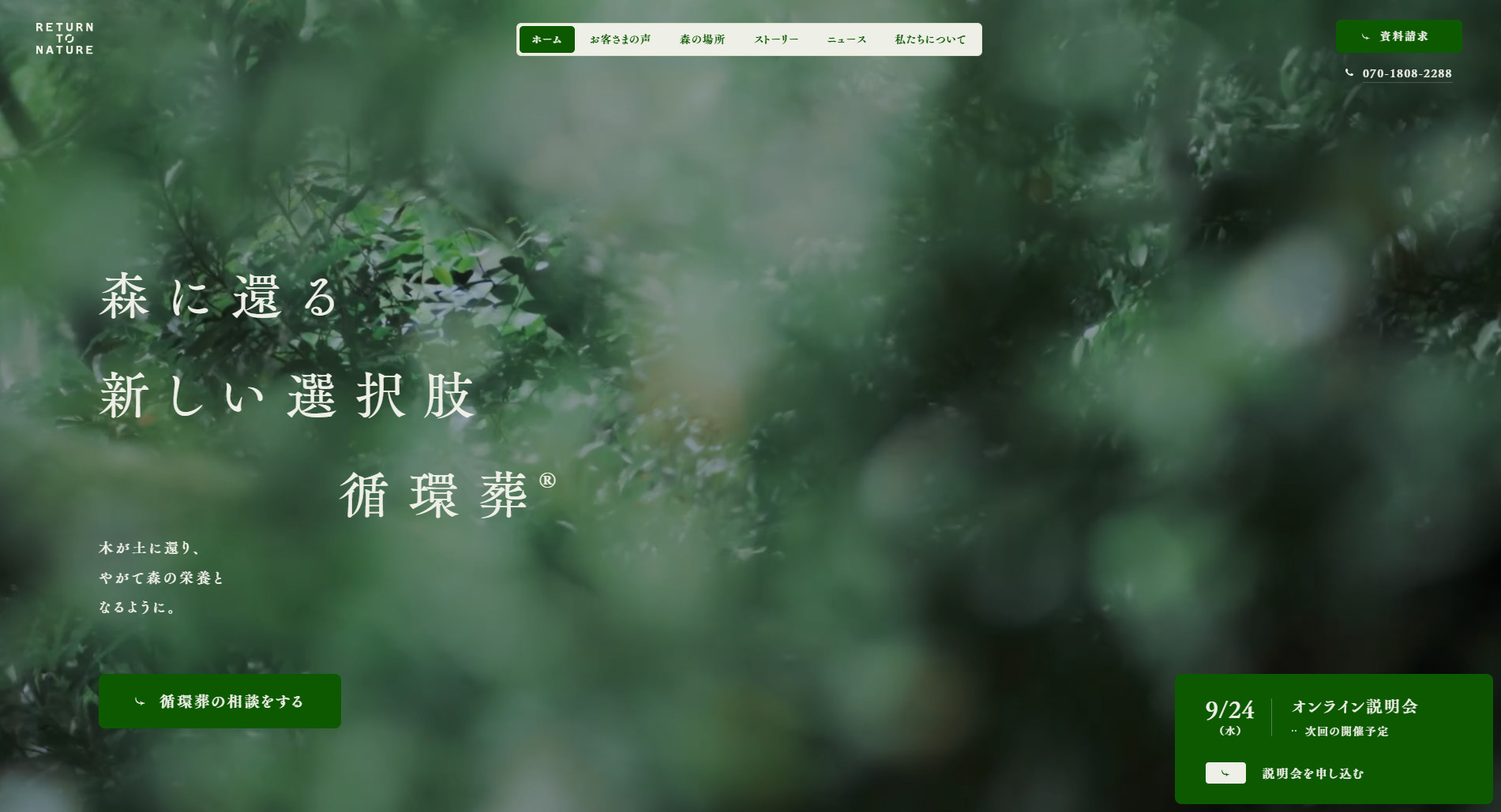 DESCRIPTION|循環葬® RETURN TO NATURE 森と生きる、森に還る、森をつくる。人にも環境にもやさしい森林埋葬・自然葬という新しいお墓のかたち。自然の循環に寄り添う、心やすらぐ最期の選択を。