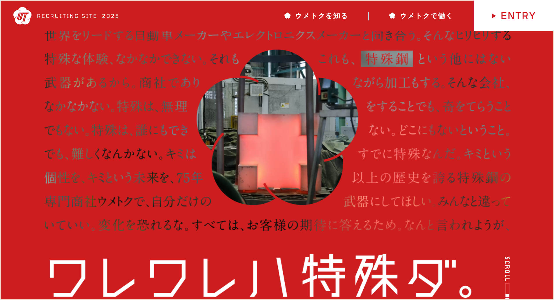 DESCRIPTION|特殊鋼の専門商社として国内トップクラス・ウメトクの新卒採用サイトです。商社でありながら加工もする。特殊鋼を武器に世界をリードするさまざまなメーカーと対峙する。そんなワクワクする会社、なかなかない。ワレワレハ特殊ダ。